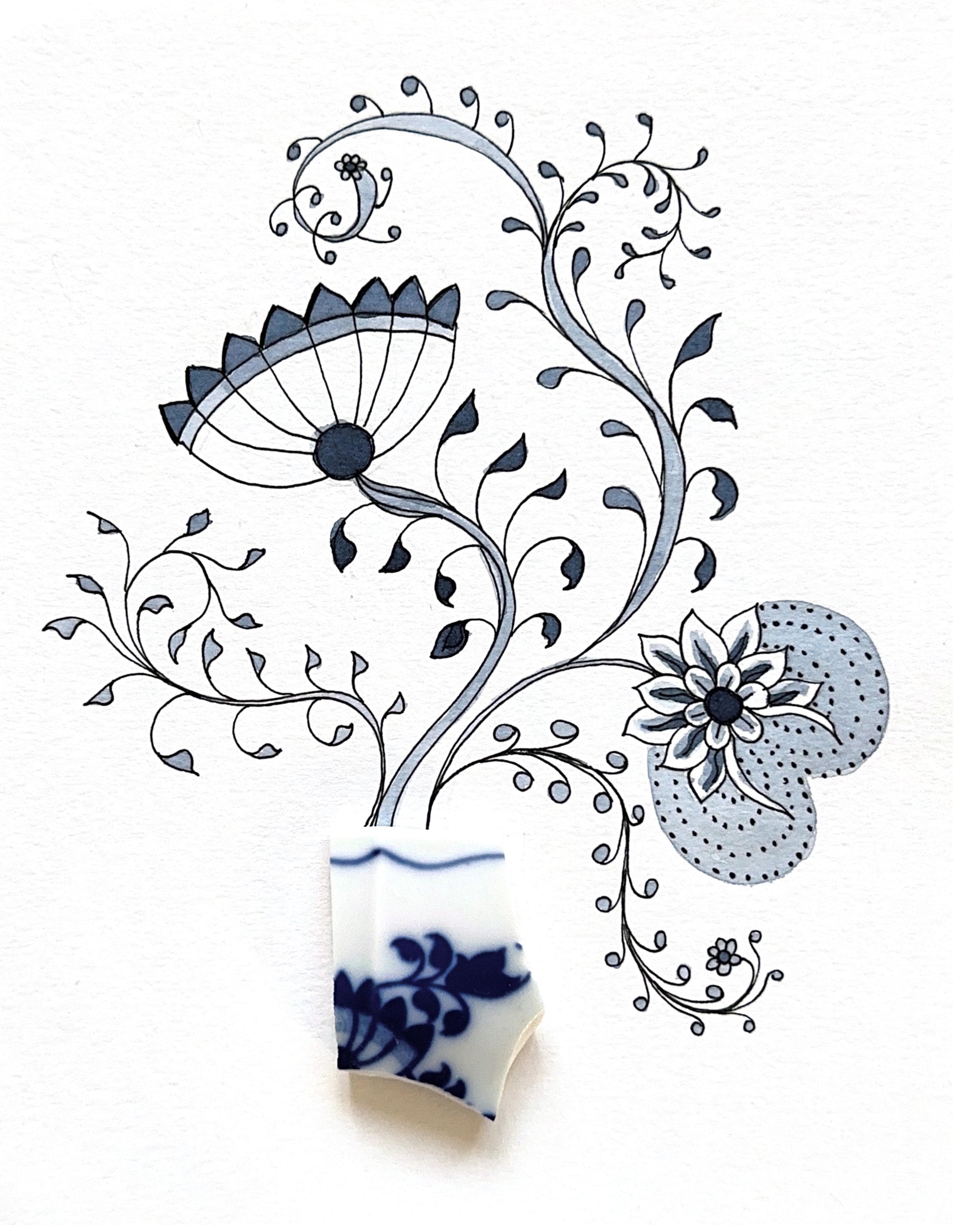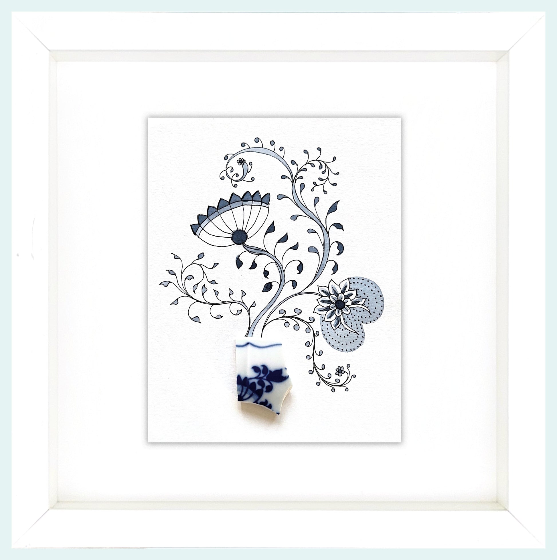 Found ceramic fragments and shards of glass, with watercolour and ink artwork on 240gsm watercolour paper