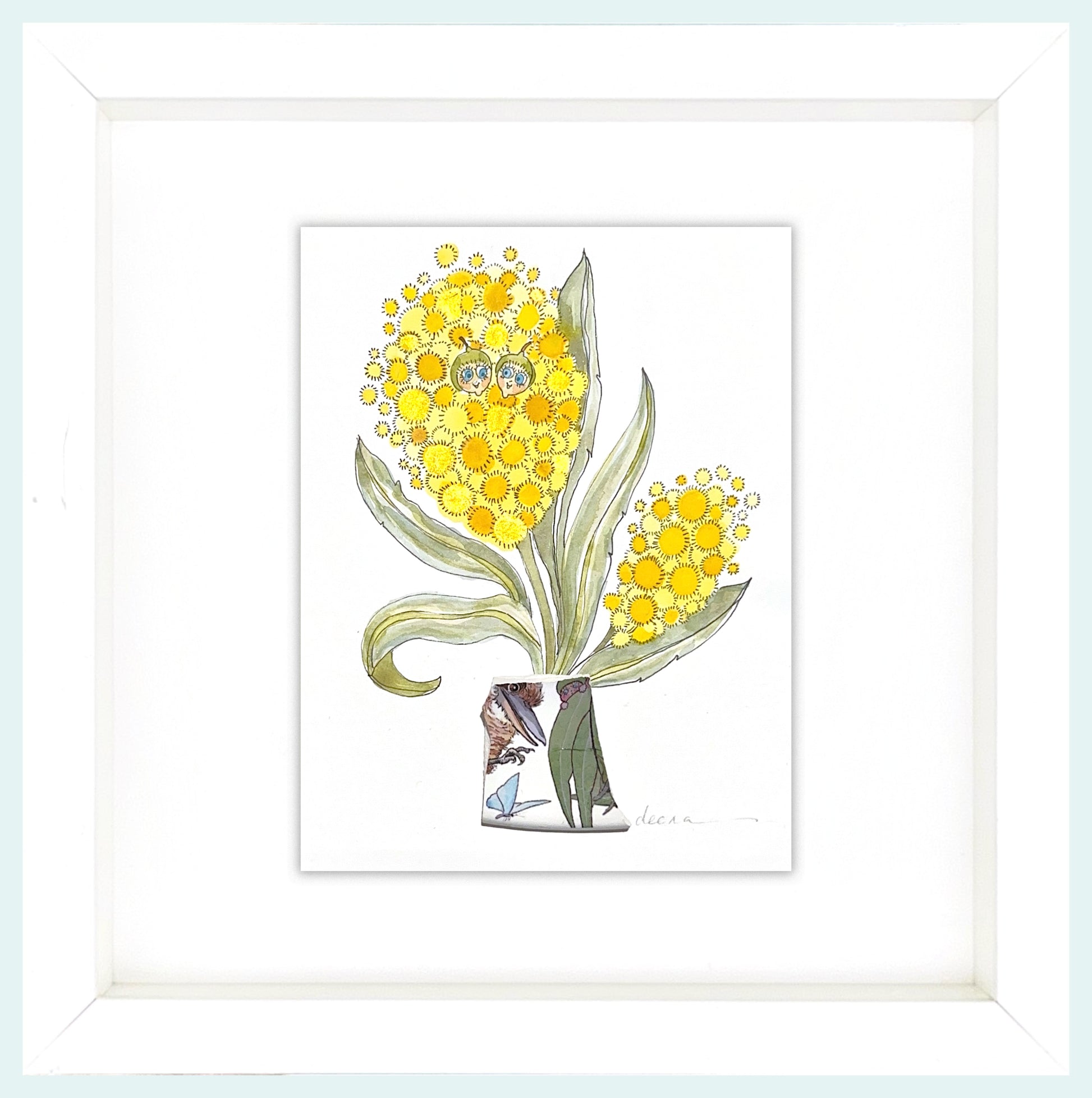 Artwork is in a deep-set square white frame with white mat (270mm x 270mm x 60mm)