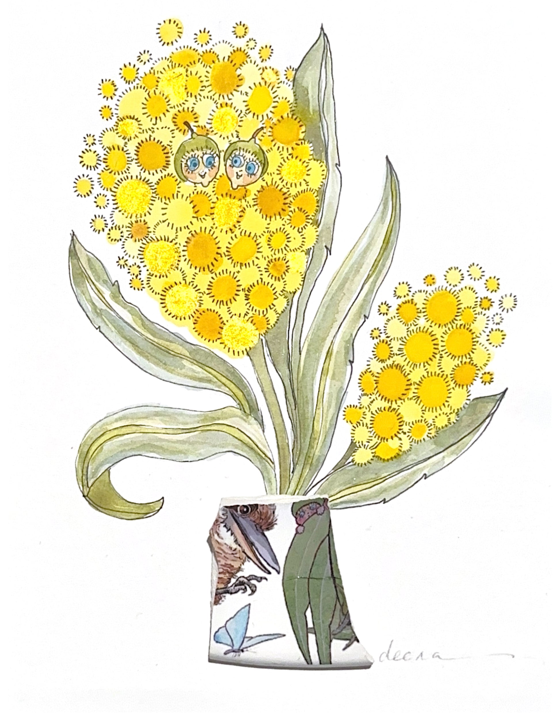 Found ceramic fragments and shards of glass, with watercolour and ink artwork on 240gsm watercolour paper