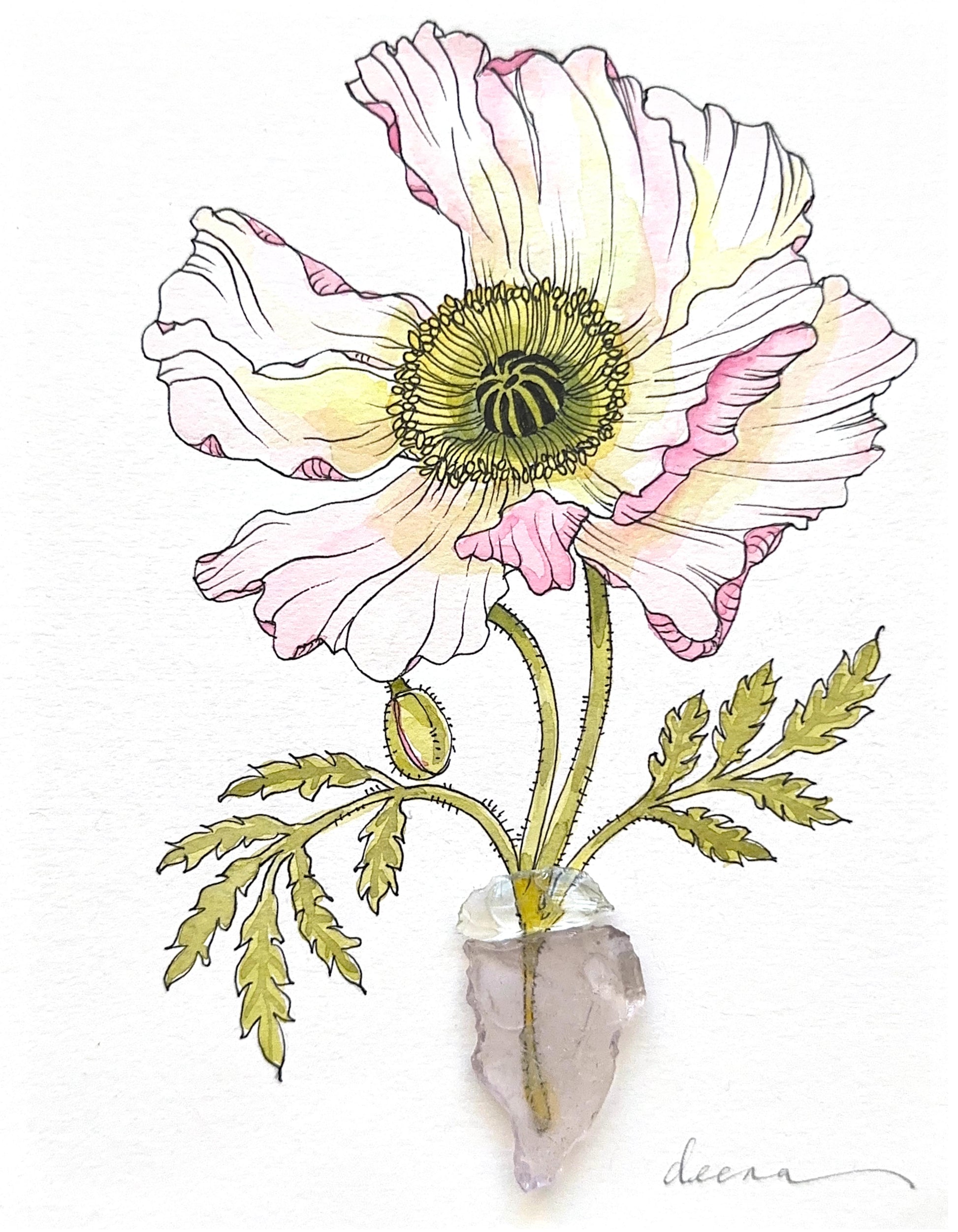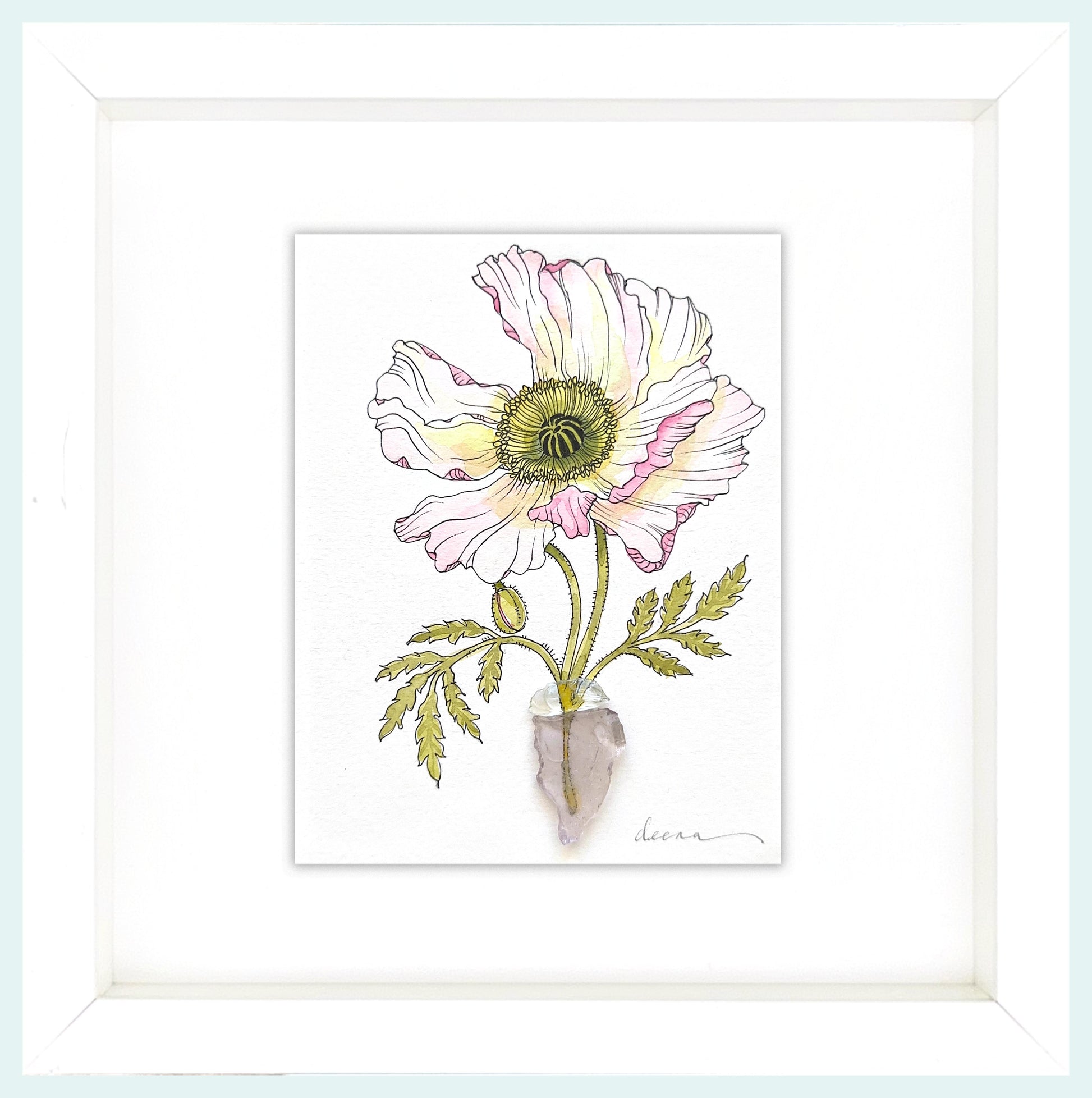 Found ceramic fragments and shards of glass, with watercolour and ink artwork on 240gsm watercolour paper