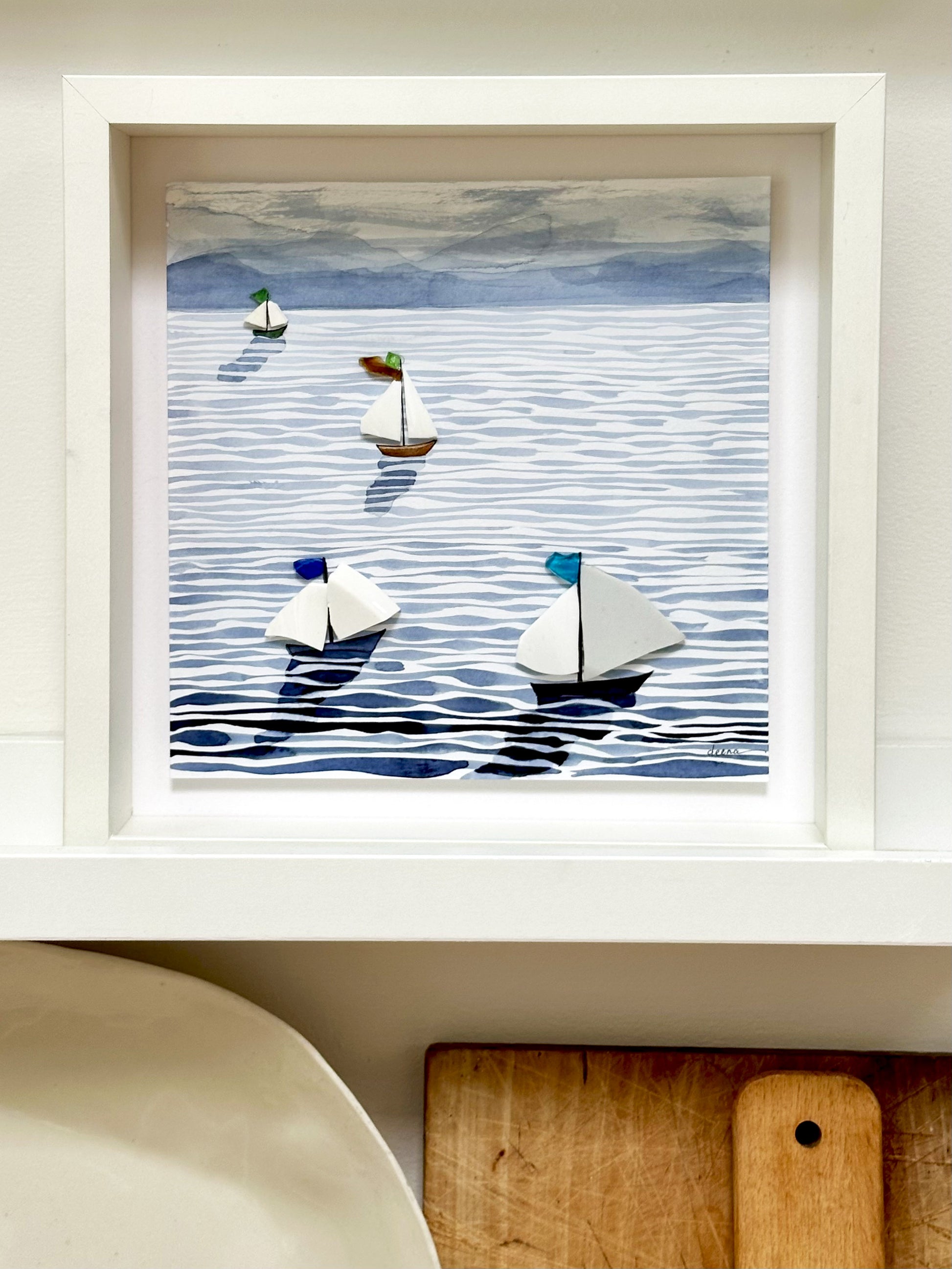 Artwork is float mounted in a deep-set square white frame with white mat (270mm x 270mm x 60mm)